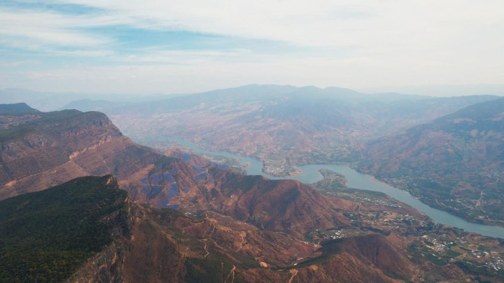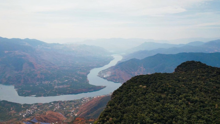 除却惊心动魄的悬崖地貌,羊桥天壁最动人的,便是它与金沙江隔空对望的山河盛景。金沙江自雪域高原奔流而来,穿过重重山峦,在这片绝壁之下蜿蜒成一条碧绿的玉带,江水奔腾不息,浪涛拍打着崖壁,与沉稳静默的天壁形成刚柔并济的绝美呼应。立于天壁之巅极目远眺,群山层峦叠嶂,连绵起伏向远方延伸,金沙江穿梭于峡谷之间,时而平缓流淌,时而湍急奔涌,山河相依,动静相生,勾勒出一幅气势恢宏、意境辽阔的西部山水长卷。清晨时分,云雾缠绕在崖壁腰间,金沙江若隐若现,宛如仙境;日暮之时,夕阳洒在崖面与江面,金辉漫卷,天地间一片壮阔,每一刻的景致都截然不同,每一眼望去都堪称视觉盛宴。