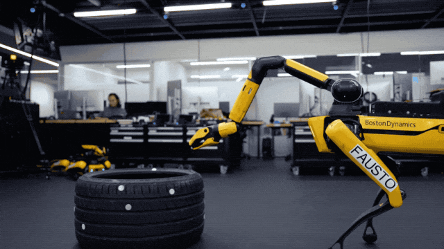 搬运的轮胎重达15公斤,相当于Spot自身重量的一半(32.7千克),并远超其最大臂力。