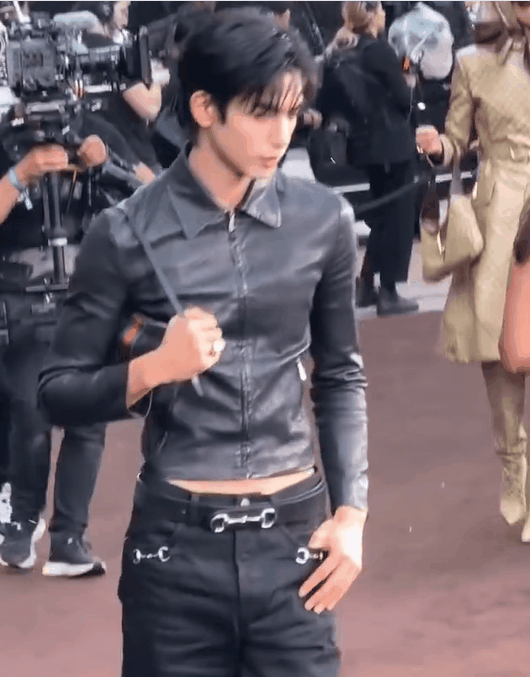 黑色露脐皮夹克搭配西装裤,原本干练的全黑套装在宋威龙身上却展现的格外油腻。
