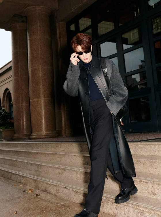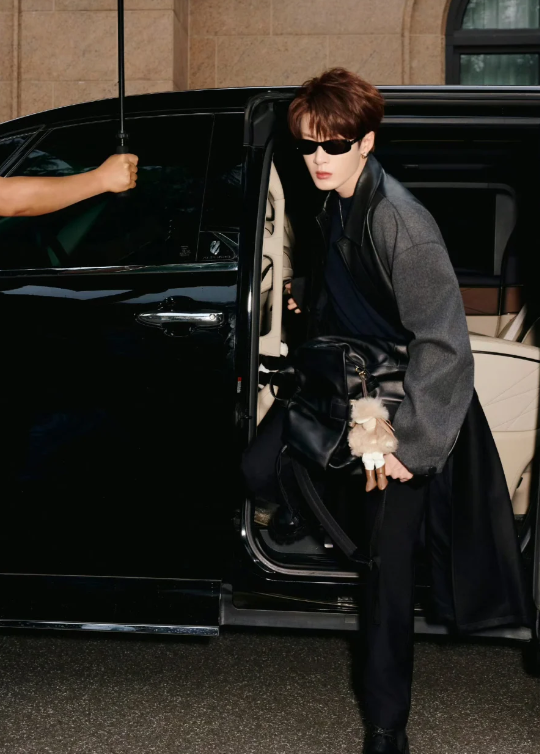 不同于上一次时装周的学院风造型,这一次檀健次选择了灰色大衣搭配西装裤。