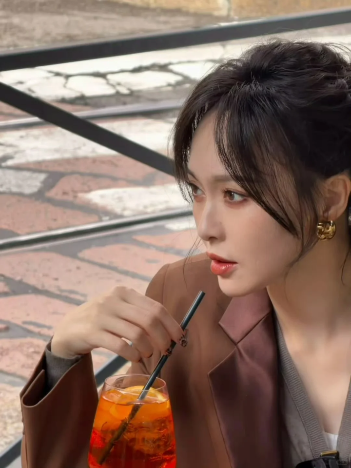 蛋卷长发披肩,拿着咖啡走在米兰街头,给人一种大学校园里女神降临的电影故事感。