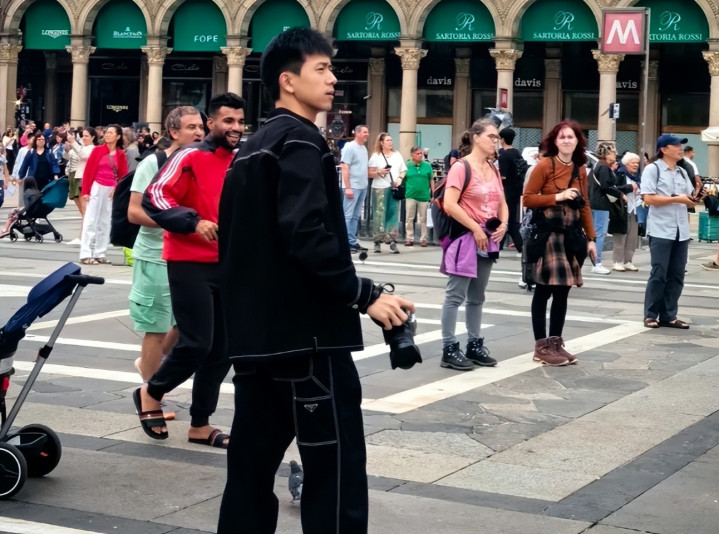 下了飞机后这哥没有立马换装前往时装周秀场,反而穿着机场出发的行头,拿着相机在米兰街头“闲逛”了起来。