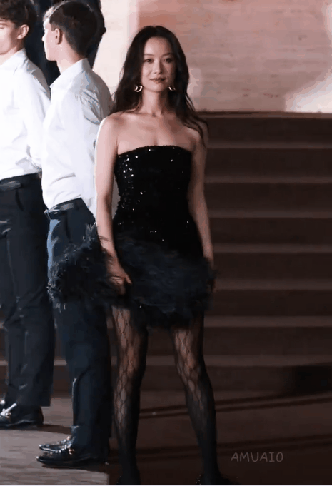 此次米兰时装周,她身穿一袭黑色抹胸亮片连衣短裙,搭配同色系羽毛披肩。