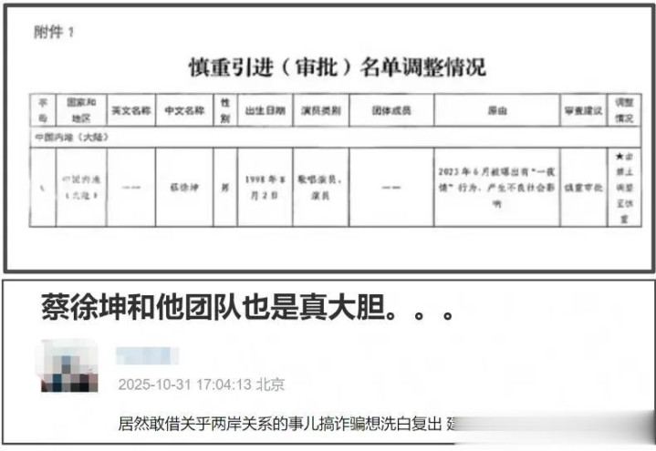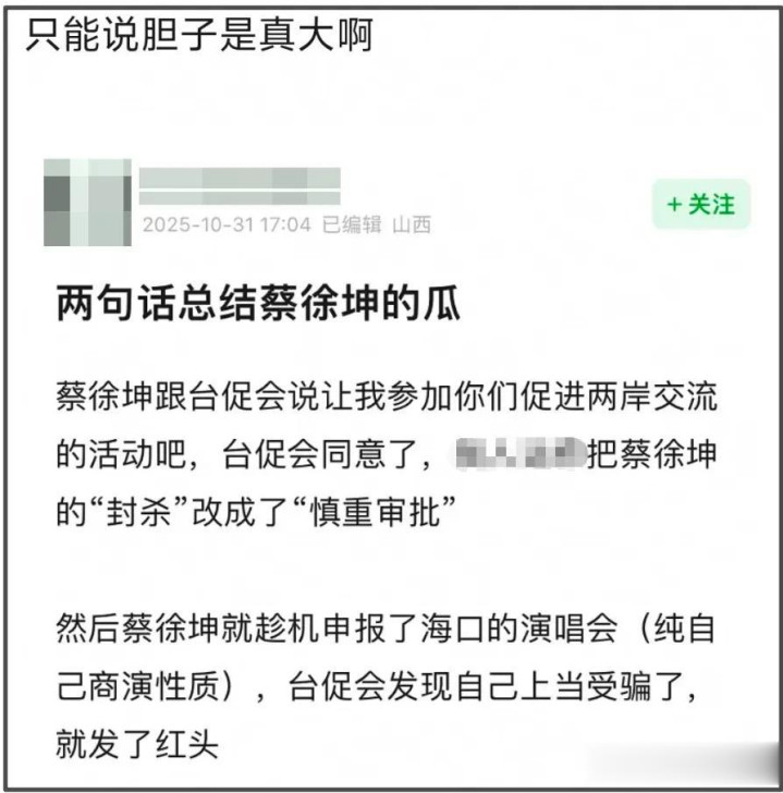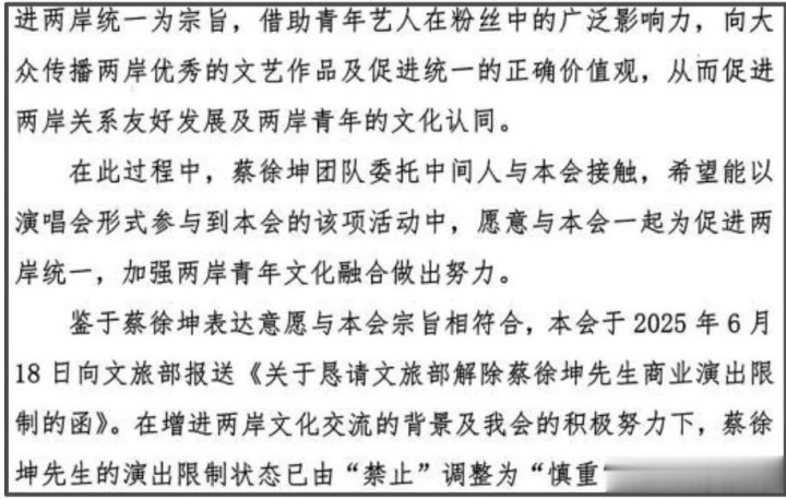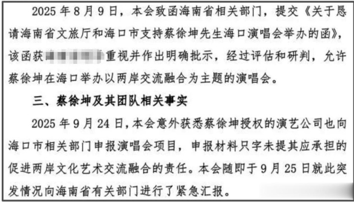 2025年8月,蔡徐坤被允许参加两岸交流演唱会;2025年9月,台促会得知其他演艺公司申报了蔡徐坤演唱会项目,两场演唱会位于同一地点,都在海南省海口市。