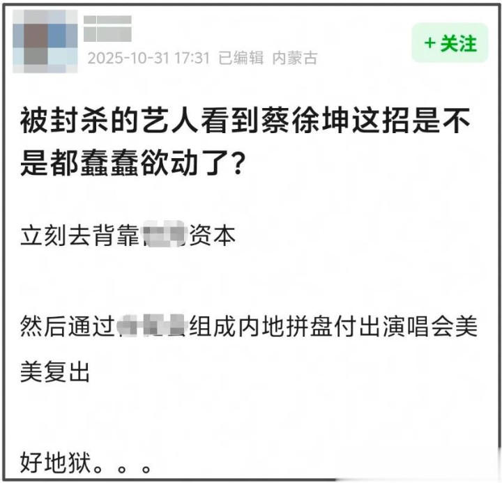 不过随着舆论升级,知名狗仔葛斯齐出现了,还记得蔡徐坤卷入私生活争议的时候,他就表示自己手头有料,如今又一次把矛头对准蔡徐坤,上来就是一句“对于该艺人及团队出尔反尔许多过往内幕已无需再谈,失德艺人必须凉”。