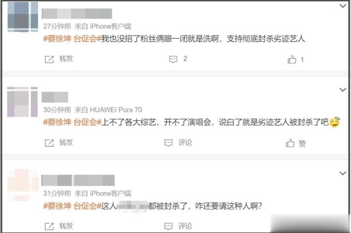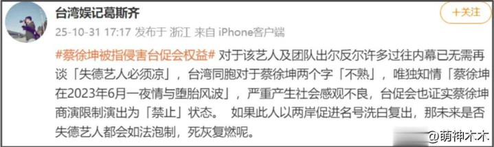 在网友看来,这属于严重投机行为,而且还是在两岸交流演出上耍小聪明,网友纷纷呼吁台促会抓紧时间维权追责、及时止损吧,先把蔡徐坤限制演出状态调整回来,让他继续被封杀着吧!