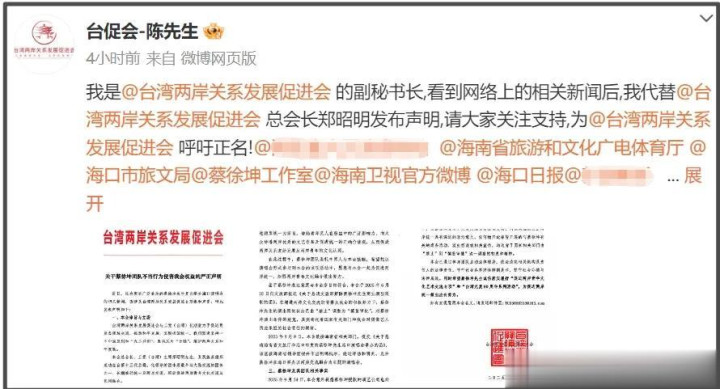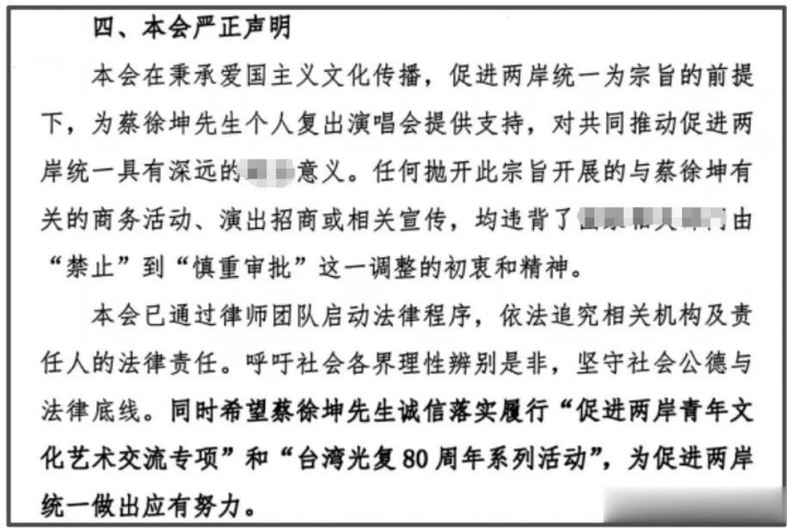 这里简单总结一下声明重点,台促会为了促进两岸文化交流计划举办一系列活动,蔡徐坤团队主动与他们接触,希望与台促会一起举办以两岸交流融合为主题的演唱会,期间台促会努力推动了蔡徐坤限制演出状态调整,让他从“禁止”变成了“谨慎审批”。