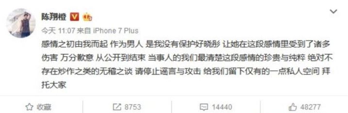 陈翔在微博上毫无征兆地官宣与毛晓彤和平分手,其对分手原因的淡定解释让网友们“浮想联翩”。
