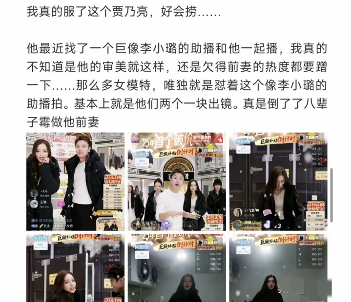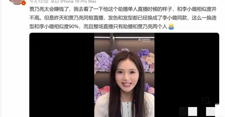直播助理也被其他网友证实有看过,单人直播的时候其实和李小璐不怎么像,两人一同框就换成了李小璐同框发型和妆容了,贾乃亮真的太会赚钱了。