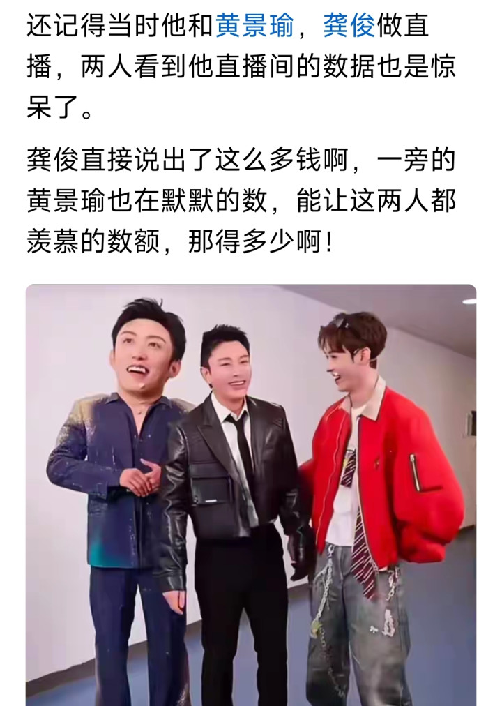 早在龚俊,贾乃亮和黄景瑜三人一同直播的时候,龚俊和黄景瑜看到贾乃亮直播间的数据都被震惊到了,而且当着镜头前龚俊就说出了这么多钱的感叹,能让龚俊都羡慕的金额数据,可想而知贾乃亮的一场直播收入到底有多庞大了。