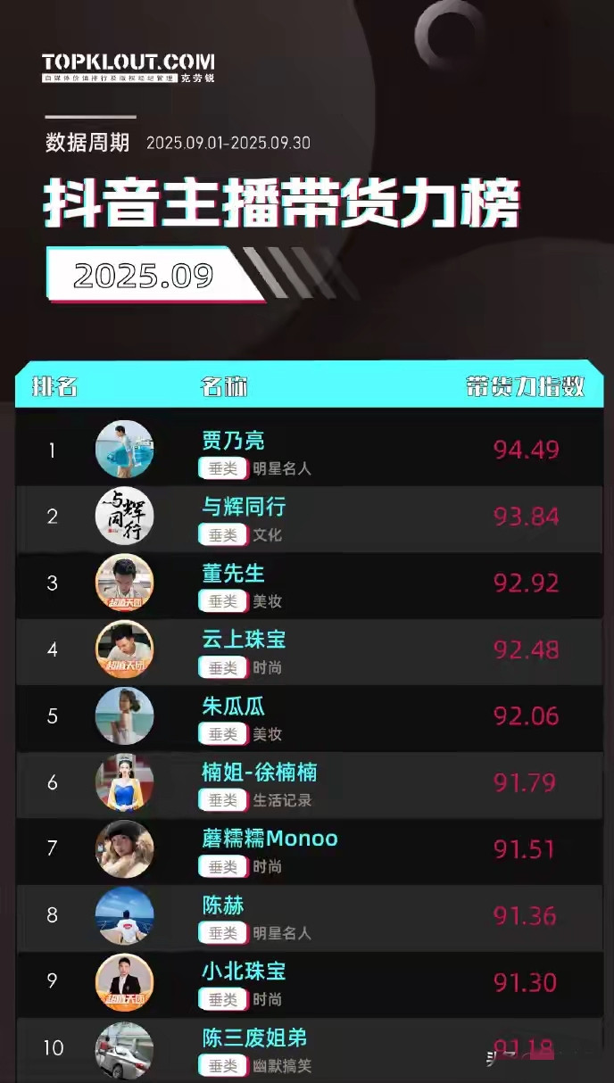根据数据显示贾乃亮的抖音主播带货力榜已经超越了董宇辉,陈赫等明星,也远超陈三废等大网红,跃居第一了。