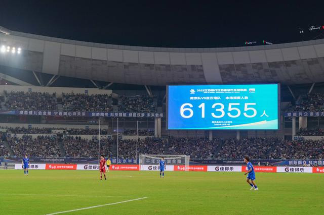 10月4日,大屏幕显示本场比赛共有61355名球迷到场观赛。“苏超”四分之一决赛中,南京队主场与连云港队在常规时间1比1战平,通过点球大战,南京队以5比3的总比分战胜连云港队,晋级半决赛。新华社发